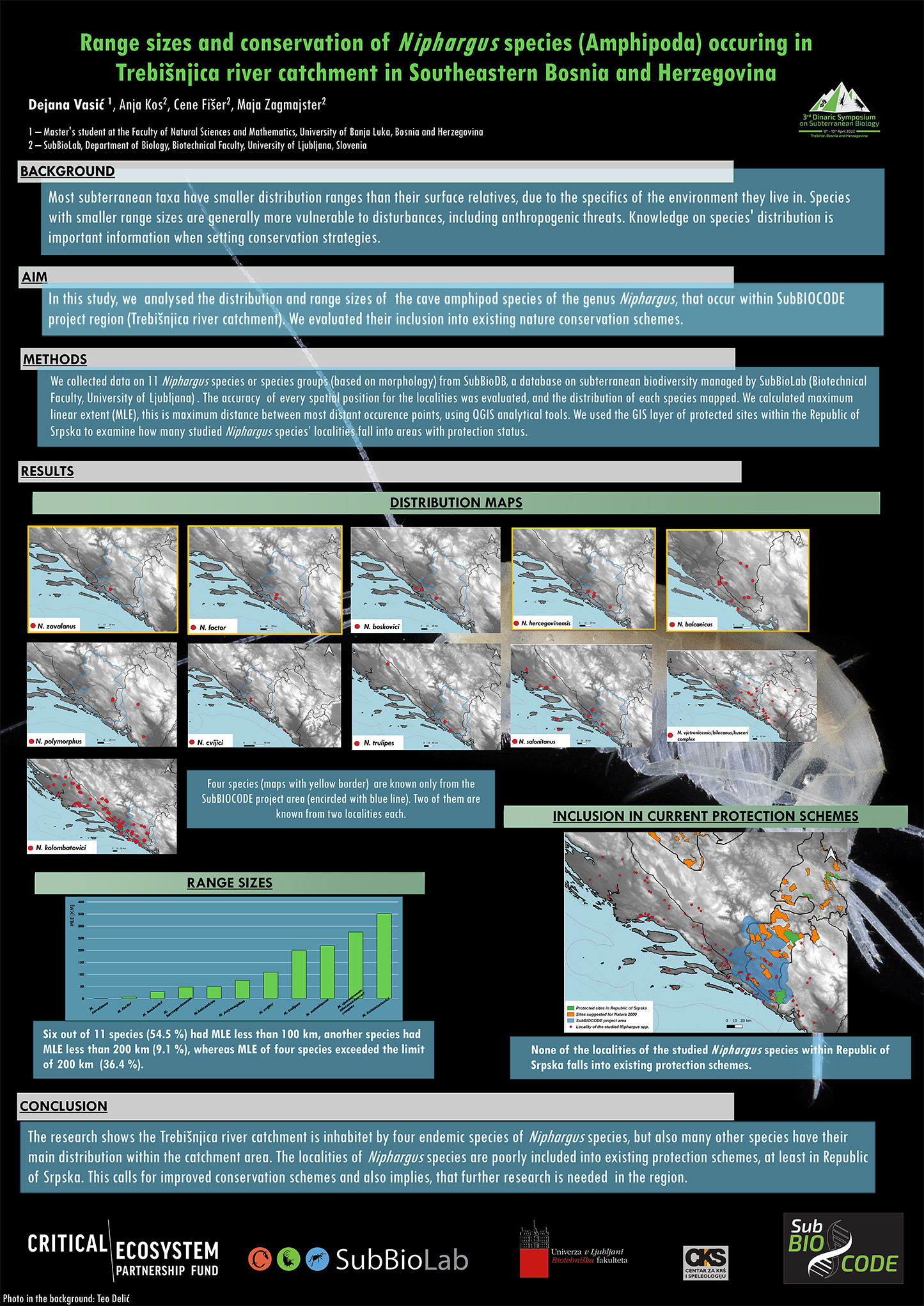 Vasić D., Kos A., Fišer C. Zagmajster M. (2022). Range sizes and conservation of Niphargus species (Amphipoda) occuring in Trebišnjica river catchment in Southeastern Bosnia and Herzegovina. Poster presented at the 3rd Dinaric Symposium on Subterranean Biology, 9.-10. April 2022, Trebinje.