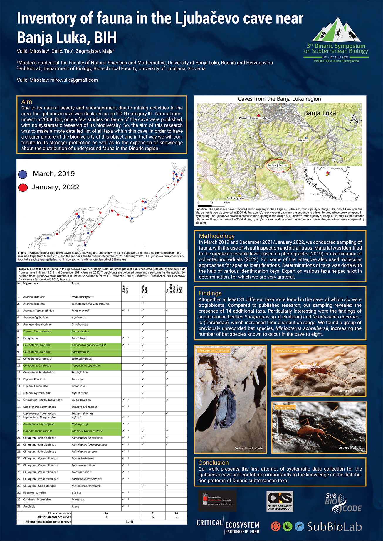 Vulić M., Delić, T., Zagmajster M. (2022). Inventory of fauna in the Ljubačevo cave near Banja Luka, BIH. Poster presented at the 3rd Dinaric Symposium on Subterranean Biology, 9.-10. April 2022, Trebinje.